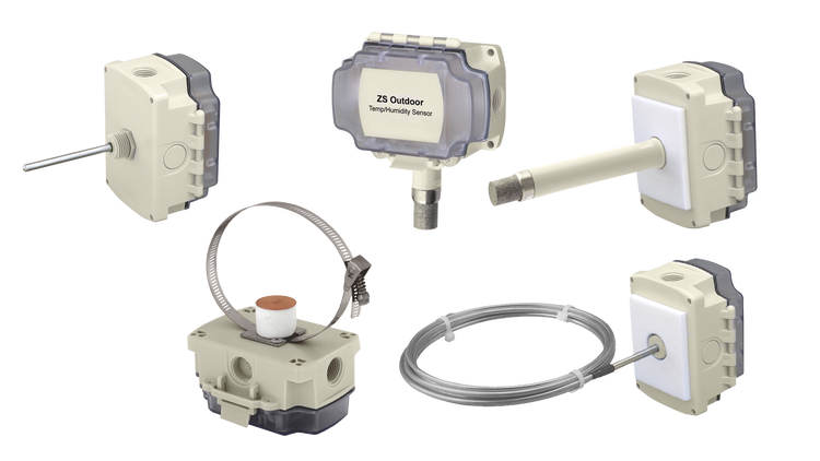 Various equipment-mounted communicating ZS sensors shown: duct, averaging, clamp-on, immersion and outdoor conditions