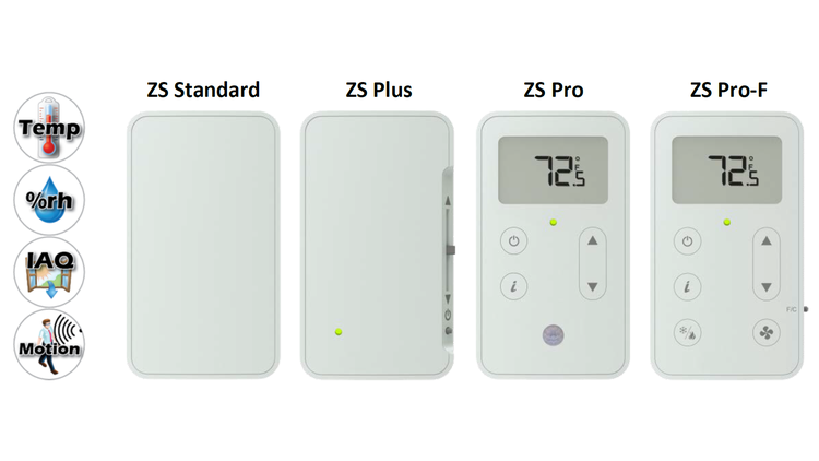 Four ZS communicating sensors shown with icons representing the sensing technologies available: temperature, humidity, IAQ and motion